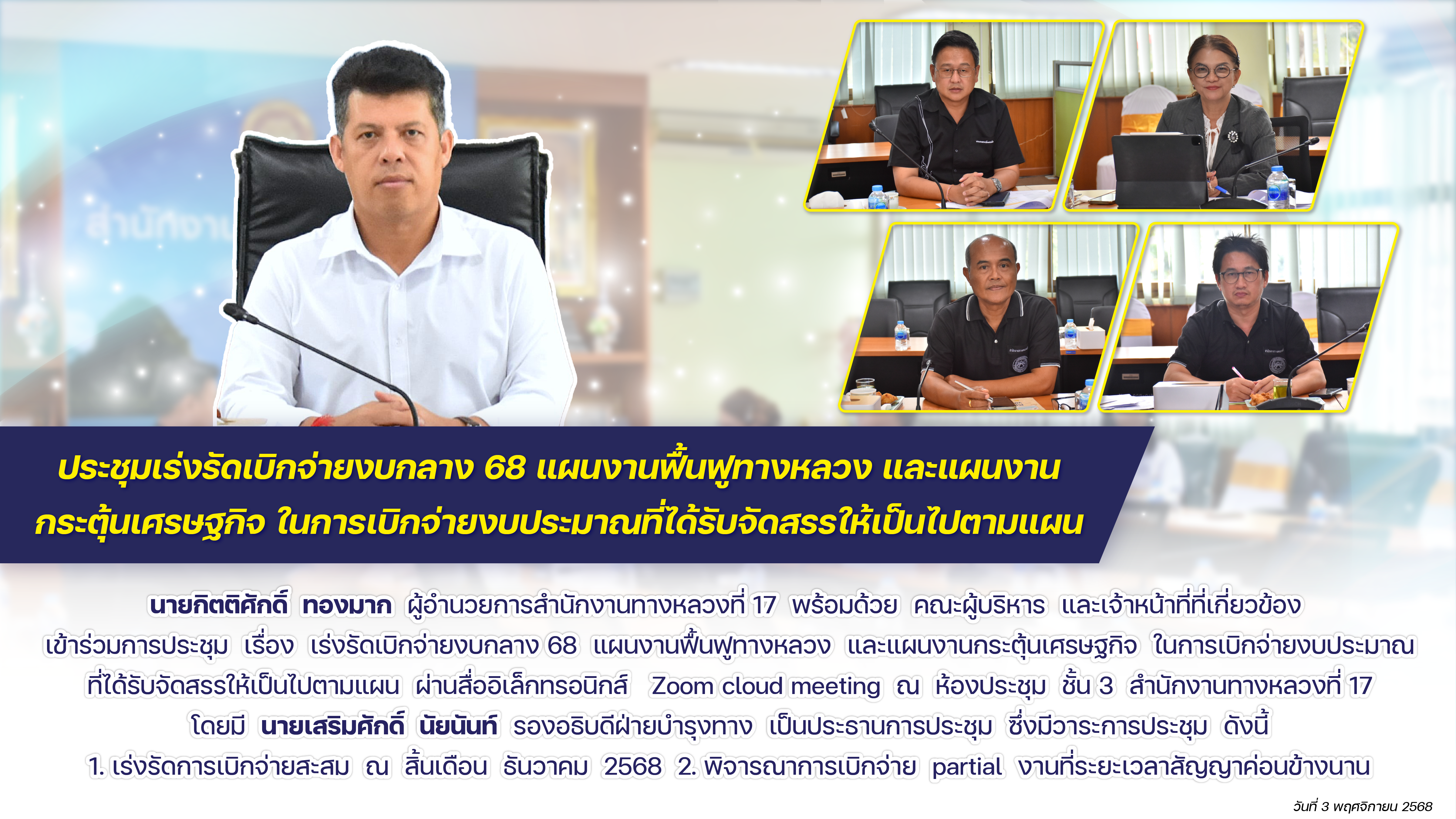 ประชุมเร่งรัดเบิกจ่ายงบกลาง 68 แผนงานฟื้นฟูทางหลวง และแผนงาน กระตุ้นเศรษฐกิจ ในการเบิกจ่ายงบประมาณที่ได้รับจัดสรรให้เป็นไปตามแผน วันที่ 3 พฤศจิกายน 2568