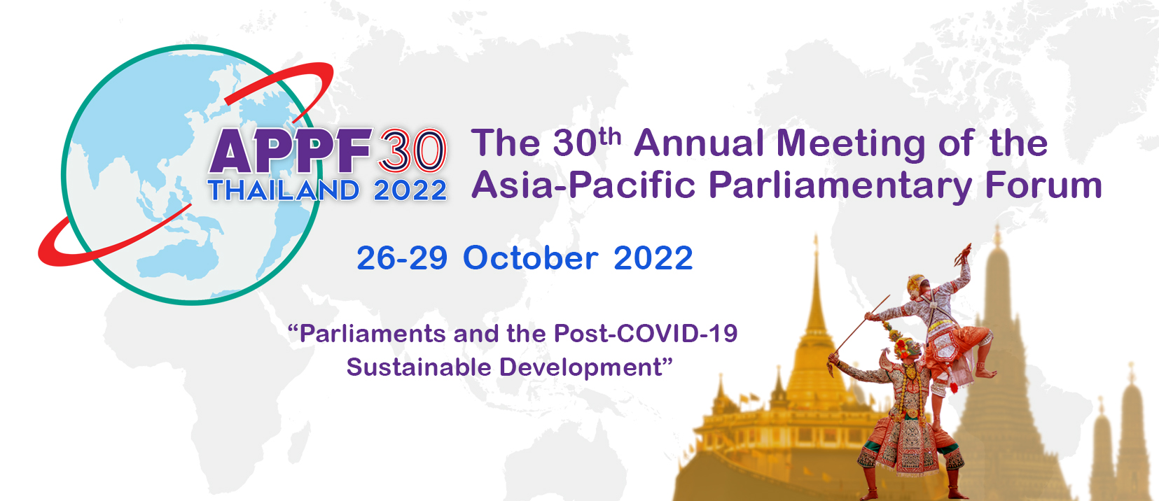 ประชาสัมพันธ์รัฐสภาไทย จะเป็นเจ้าภาพจัดการประชุมรัฐสภาภาคพื้นเอเชียและแปซิฟิก ครั้งที่ ๓๐ : Asia Pacific Parliamentary Forum (APPF 30 ) เพื่อหารือเรื่อง "บทบาทของรัฐสภาในการเร่งรัดการพัฒนาที่ยั่งยืนภายหลังการระบาดของโรคติดเชื้อไวรัสโคโรนา 2019 : Parliament and the Post-COVID-19 Sustainable Development" ระหว่างวันพุธที่ 26 - วันเสาร์ที่ 29 ตุลาคม 2565 ณ อาคารรัฐสภา