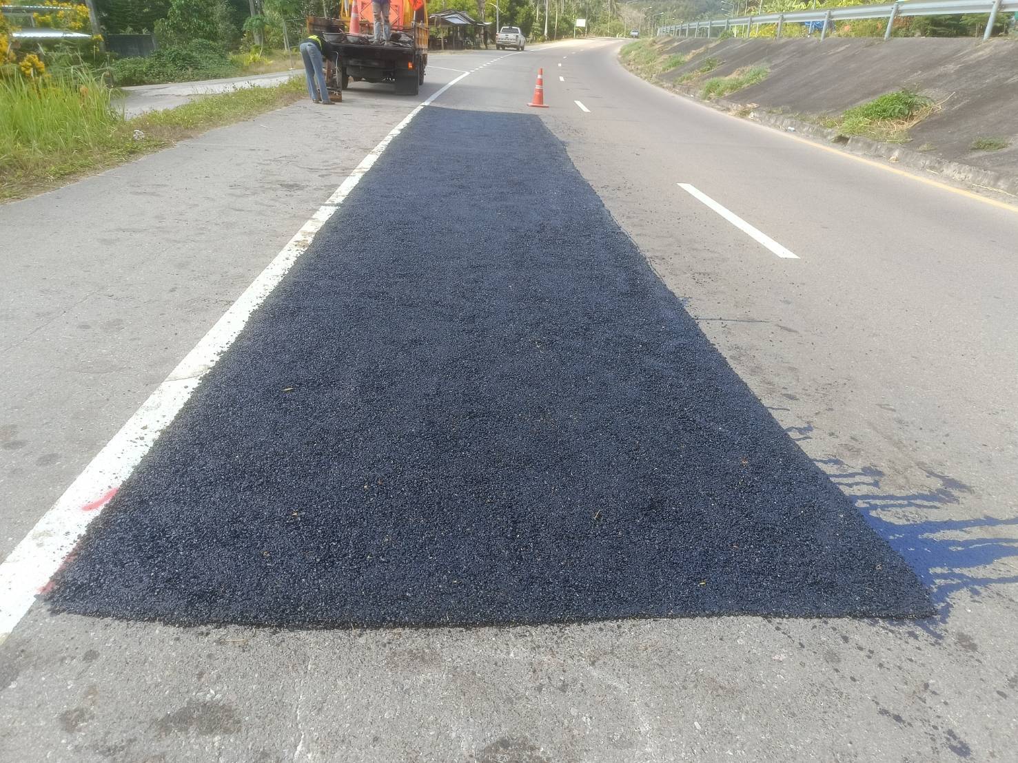 หมวดทางหลวงระนอง ดำเนินการปรับระดับผิวทางจราจร ทล.4 ตอน กระบุรี - หงาว กม.582+180