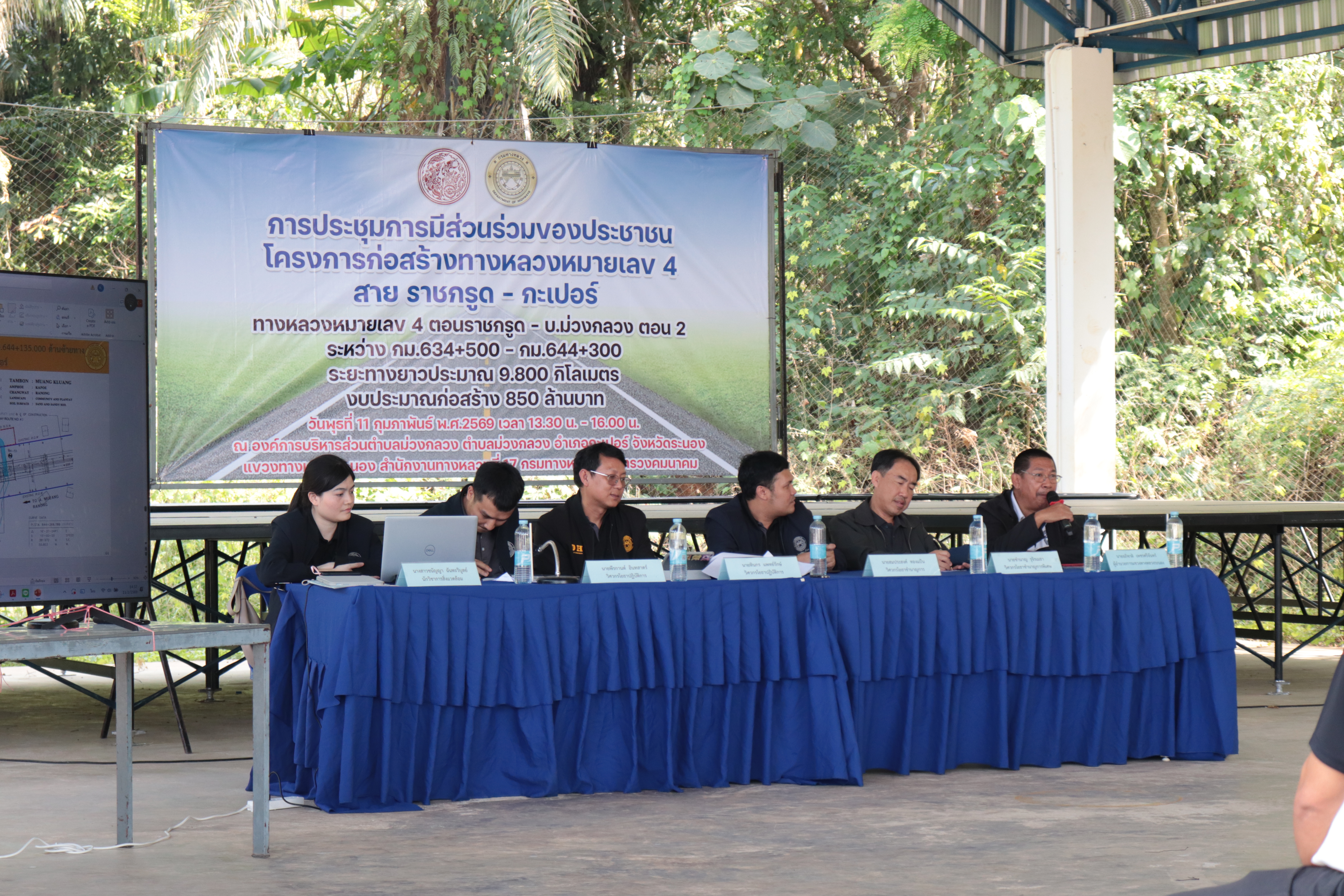 แขวงทางหลวงระนอง ดำเนินการประชุมการมีส่วนร่วมของประชาชน โครงการก่อสร้างขยาย 4 ช่องจราจร บนทางหลวงหมายเลข 4 สาย ราชกรูด - กะเปอร์ ตอน ราชกรูด - บ.ม่วงกลวง ตอน 2 ระหว่าง กม.634+500 - กม.644+300